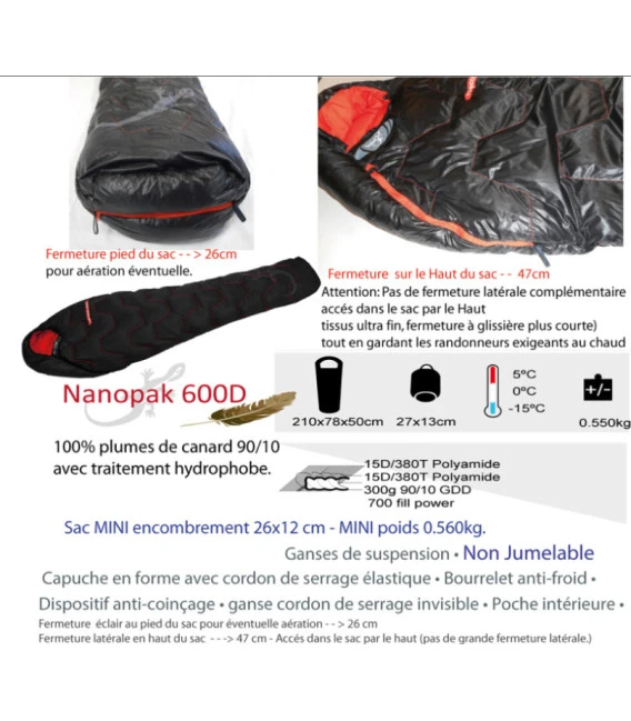 - Tissu extérieur : 15D/380T Polyamide (tissu downproof pour empêcher les plumes de traverser)